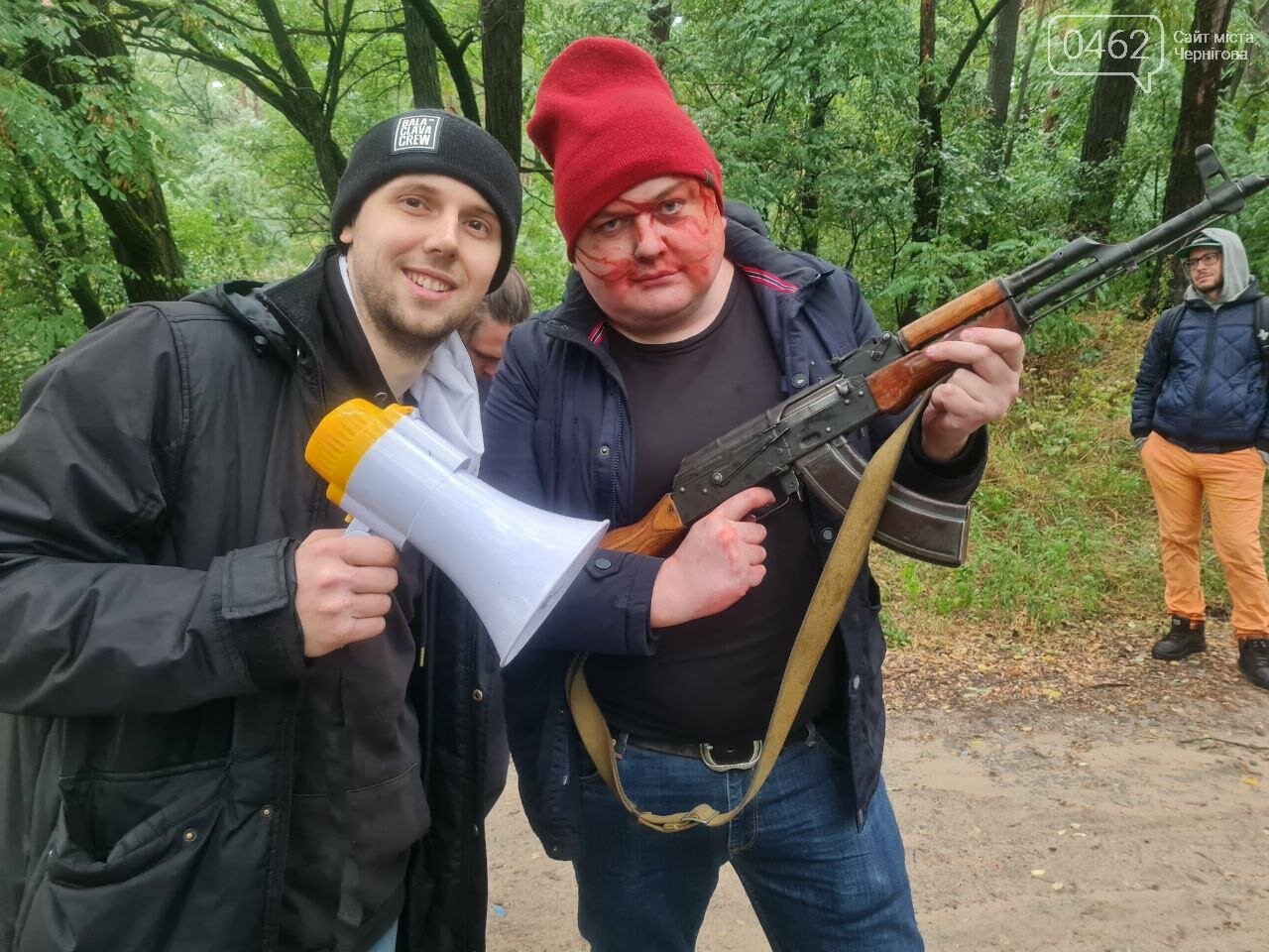 — Першою ми знімали сцену в російському штабі з Валентином Судаком. Вперше в житті я на знімальному майданчику, переді мною сидить народний артист України, а я розказую йому, що й як робити. Але все виявилось простіше, ніж здавалося, бо ми добре підготувалися, багато репетирували. З професійними акторами взагалі легко працювати, бо перед ними головне чітко поставити задачу, і вони з першого-другого разу все роблять дуже круто. Для зйомки однієї зі сцен нам надав допомогу голова Чернігівської ОВА В'ячеслав Чаус. Я звернувся з проханням, і він виділив нам на пару годин вантажівку. Російських двохсотих грали подушки й ковдри, напхані у чорні пакети.