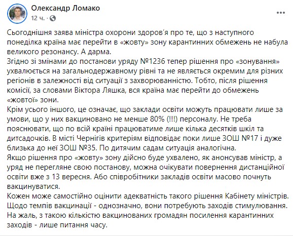 Міністр розвитку громад та територій України Олексій Чернишов та Міністр охорони здоров’я України Віктор Ляшко — вони озвучили інформацію, що як виключення навіть 1 доза вакцини у першому періоді буде зараховуватися до цих відсотків вчителям. Також спілкувався з цього приводу з Жанною Шерстюк заступницею голови Чернігівської ОДА — вона сказала, що з понеділка школи та садочки мають перейти на режим роботи, який діє для «жовтої» карантинної зони — тобто дистанційного навчання, якщо персонал вакцинований менш, як на 80%.