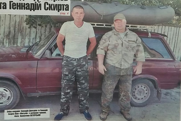 Зліва направо: Геннадій Дмитрієв та Геннадій Скирта біля "Жигулів" з рятівним човном