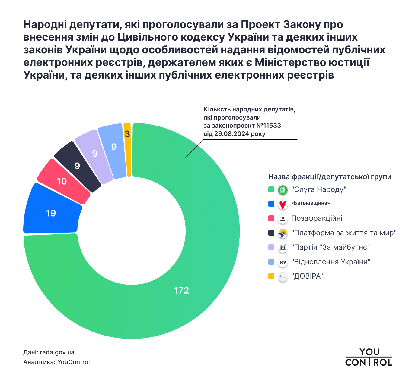 201 народний депутат 9 скликання із шести фракцій та депутатських груп: “Слуга Народу”, “Платформа за життя та мир”, “ДОВІРА”, “Відновлення України”, “За майбутнє” та позафракційні підтримали два законопроекти, що обмежують доступ до відкритих даних. Детальний аналіз голосування, потенційних загроз для громадянського суспільства та зв’язків нардепів із корпоративними групами — у новому дослідженні YouControl.