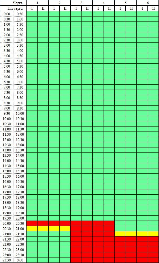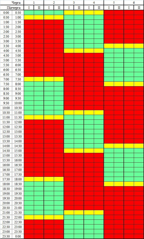 Задіяні у графіку будуть одразу чотири черги. Принцип, за яким він застосовуватиметься: три години через шість (три години зі світлом і шість годин без світла). Враховуйте: у графіку окремо відмічений час на перепідключення – у цей період електроенергія буде відключатися і вмикатися.