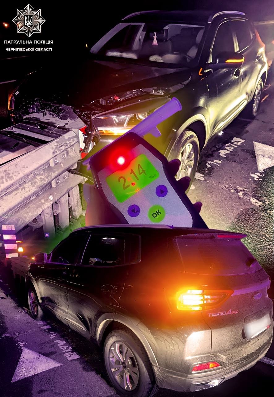 На Чернігівщині нетверезий 68-річний водій спричинив ДТП на трасі М-01, врізавшись у відбійник. Тест показав 2,14 проміле — майже в 11 разів вище допустимої норми.