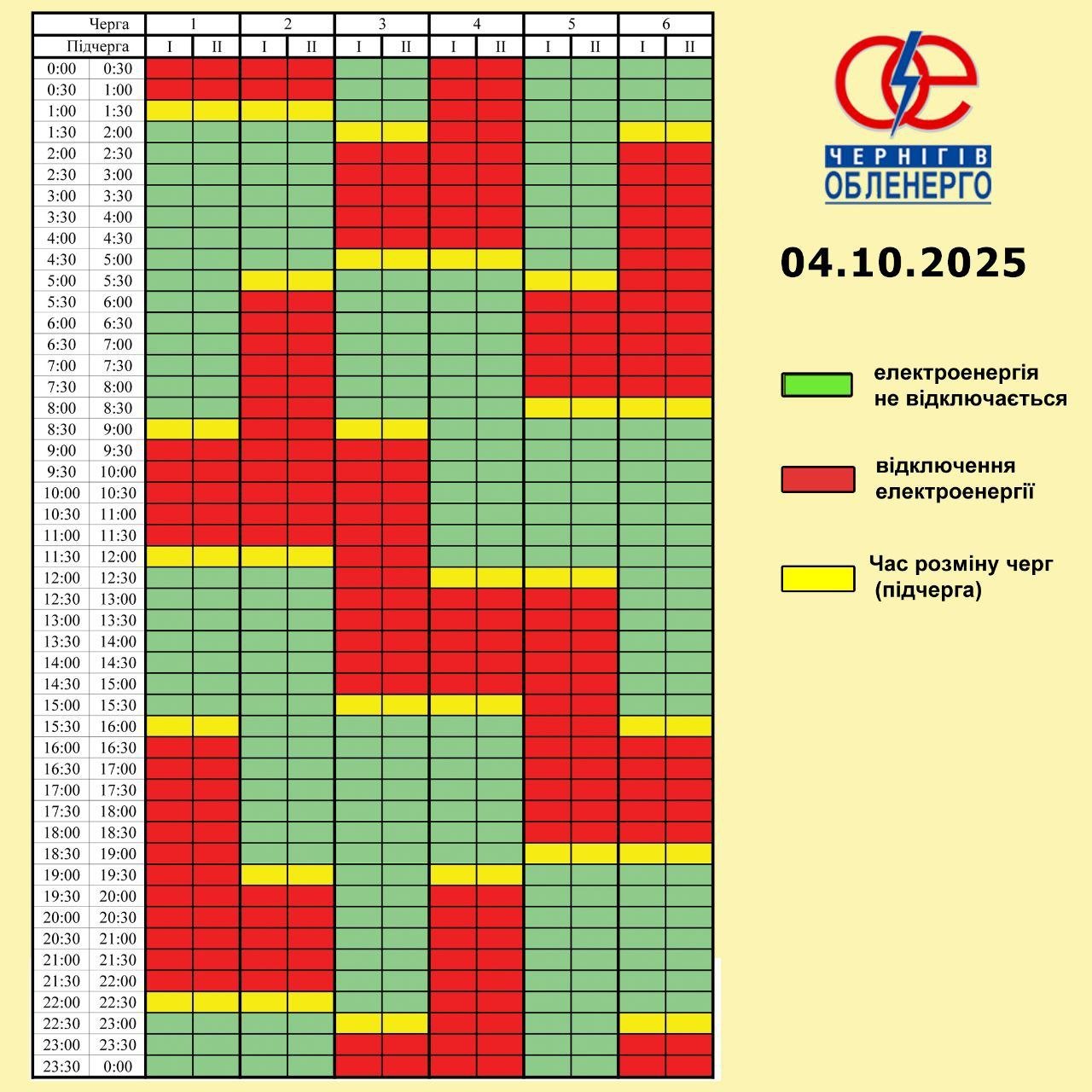 АТ «Чернігівобленерго» оприлюднило новий Графік погодинних відключень (ГПВ) електроенергії, який діятиме 4 жовтня.