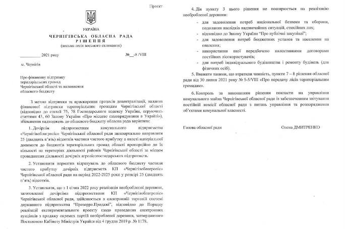 — надходження до Чернігівського обласного бюджету 25% з прибутку від продажу деревини підприємствами КП «Чернігівоблагроліс»;