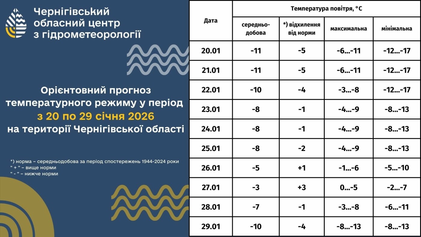 Чернігівські синоптики склали орієнтовний прогноз температурного режиму на найближчі 10 днів – з 20 по 29 січня 2026 року.