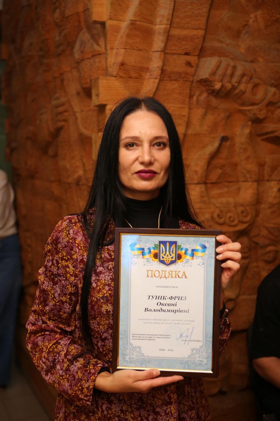 У межах заходу Подяки Міністерства культури та стратегічних комунікацій України за вагомий внесок у розвиток культури отримали фронтвумен гурту «ONUKA» Наталія Жижченко та очільниця Єдиного мистецького простору Чернігівщини Оксана Тунік-Фриз.