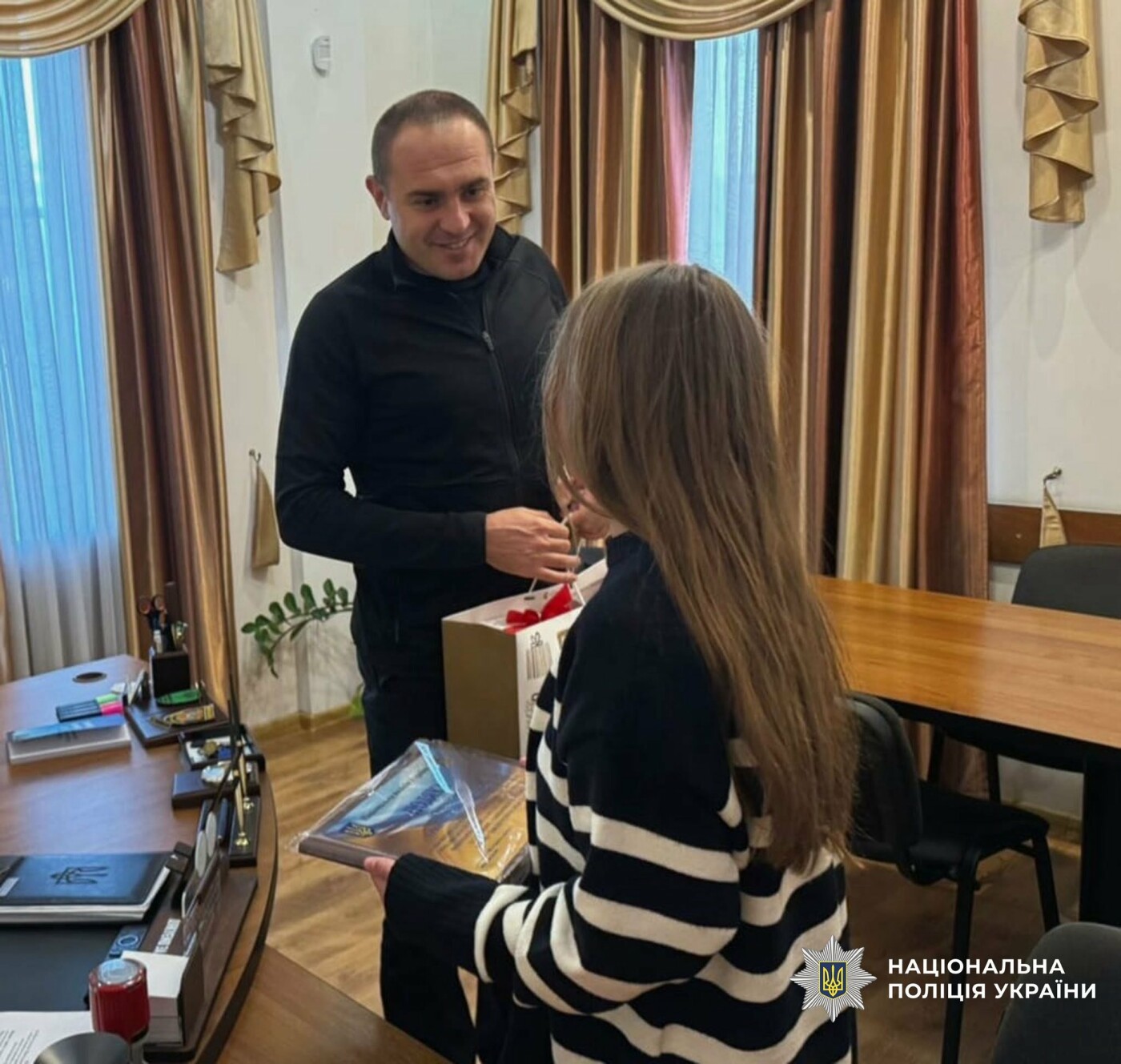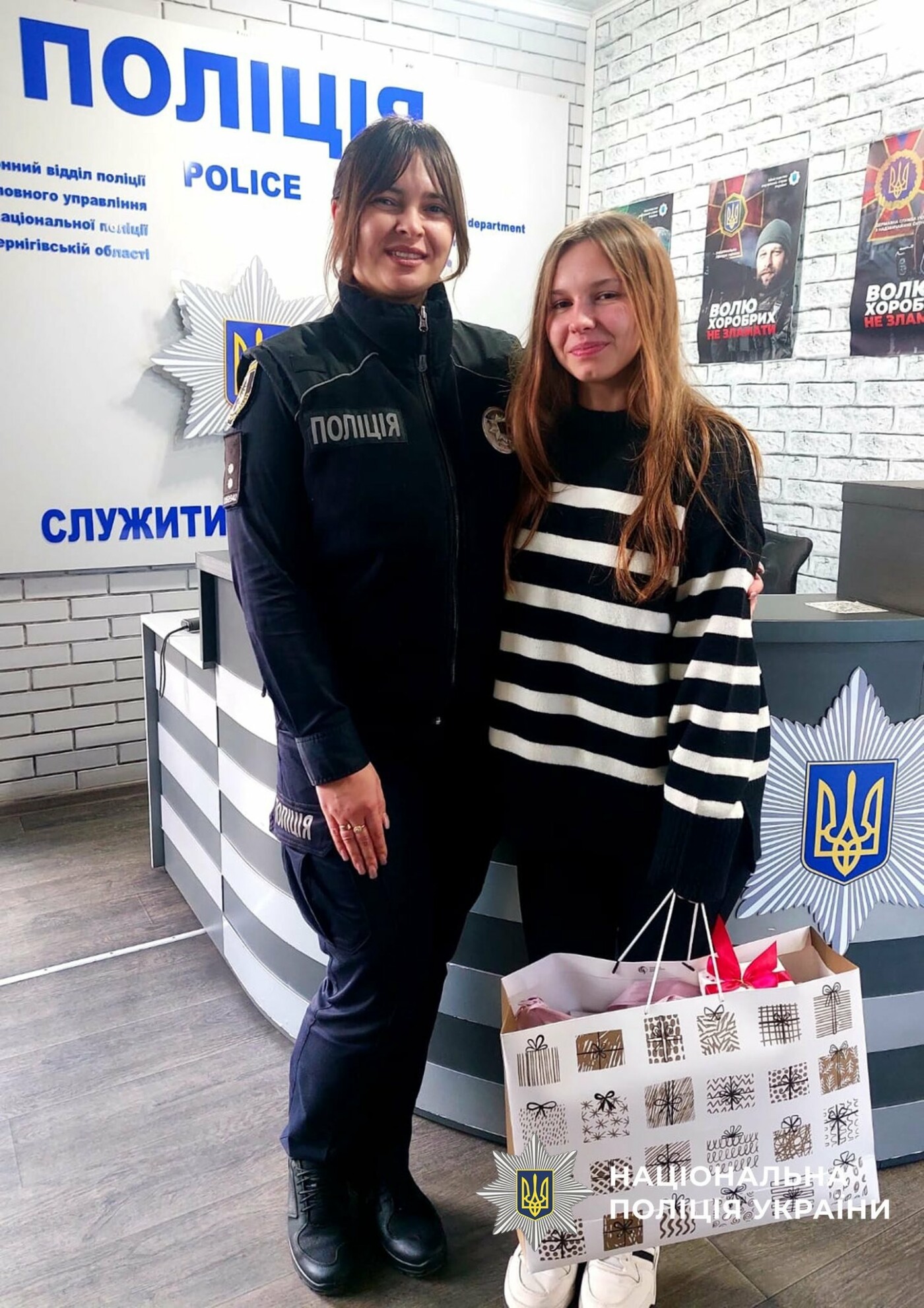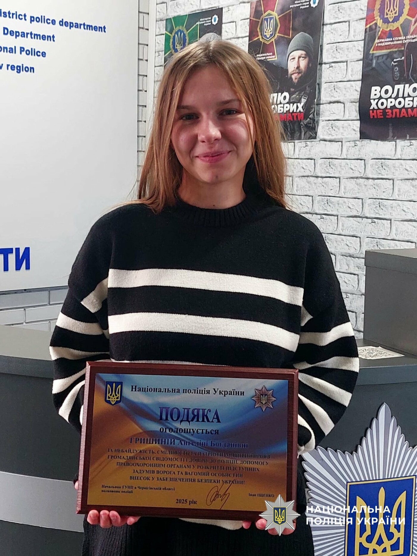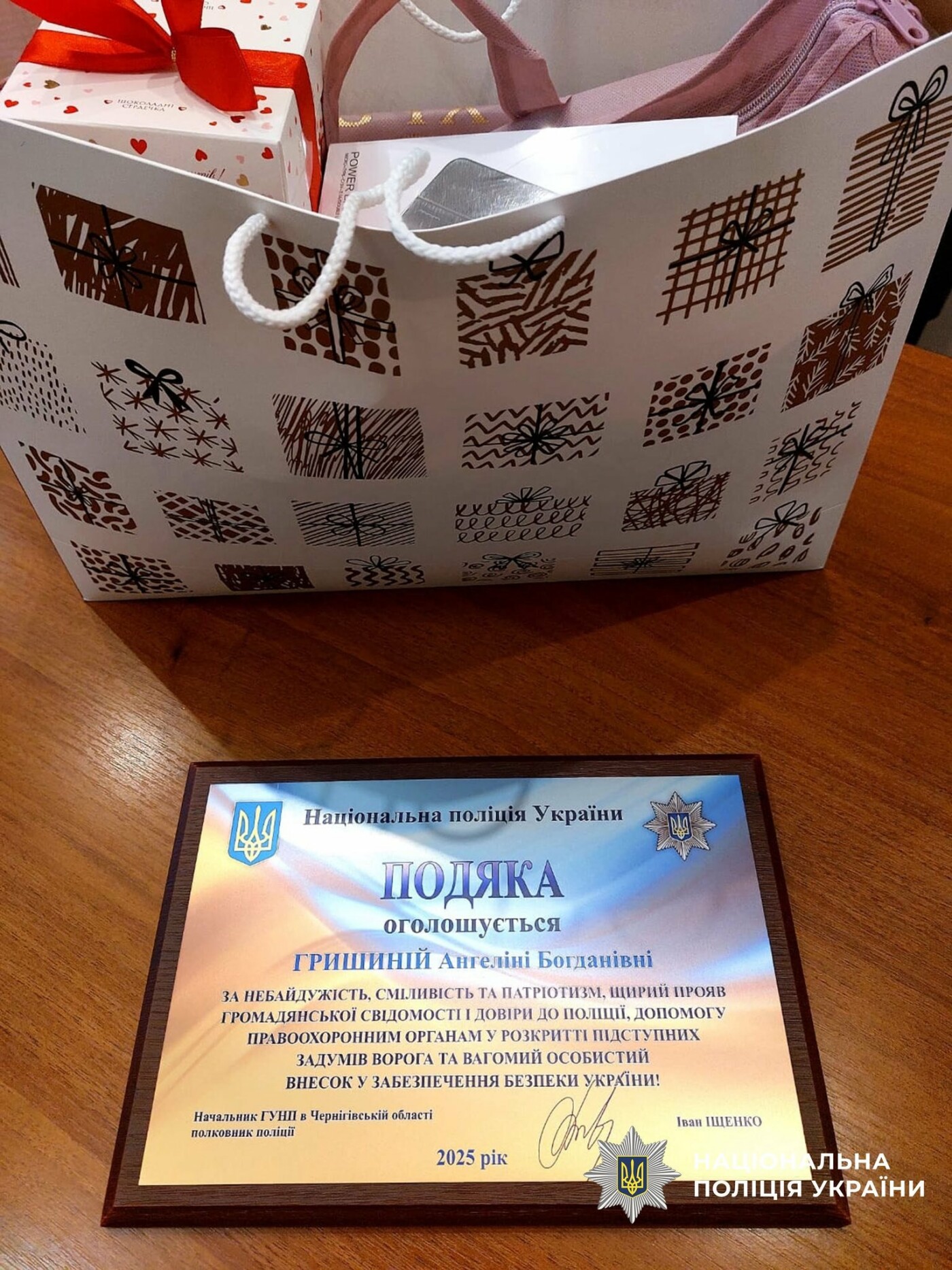 Начальник Прилуцького районного відділу поліції Василь Ободовський разом із начальницею сектору «Служба освітньої безпеки» Яною Гуменною подякували Ангеліні за свідомість та громадянську позицію, вручивши подяку та подарунок.