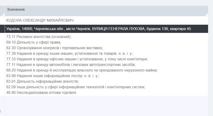 21.112019 р. Олександр Кодола, як і колись його дружина зареєстрував ФОП який проіснував до 03.11.2020 р. Як зрозуміло з декларації Кодоли дохід від його підприємницької діяльності склав не багато не мало — 1 981 207 гривень. ФОП Кодола Олександр Михайлович було зареєстровано за адресою вул.Генерала Пухова, 136 у м.Чернігів, контактний телефон якого +380462 610-259 збігається з тим, який вказано у ФОП Кодола Катерина Василівна. При цьому основний квед ФОП Олександра Кодоли — рекламні агентства. Також він мав право займатися діяльністю у сфері права, організовувати конгреси і торгівельні виставки, надавати в оренду автомобілі і т.д.