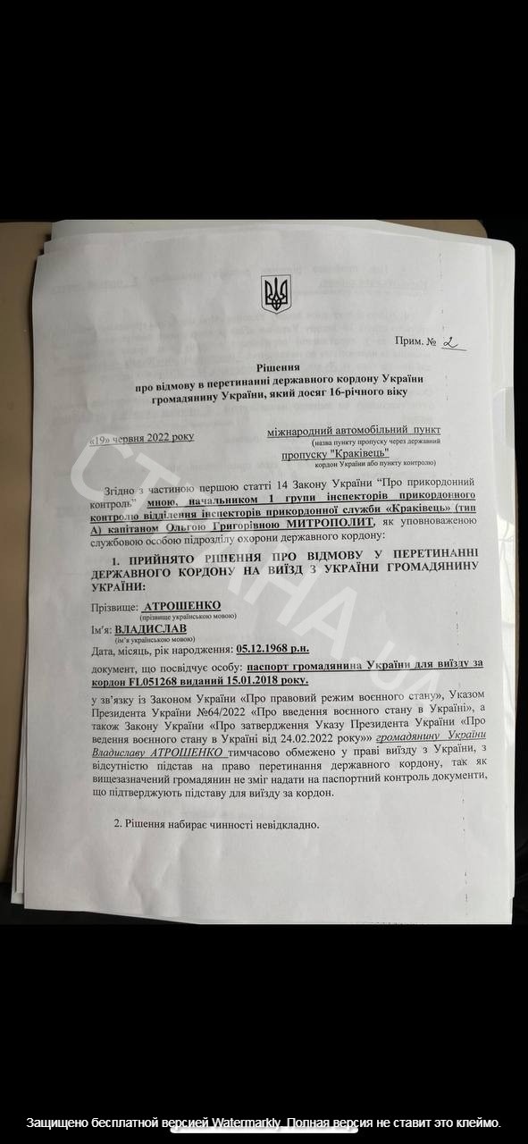 "У мене немає пояснень, чому мене не пустили. Мені їх (причин — ред.) не надали, у чому є помилки в оформленні документів чи якісь інші проблеми. Мені запропонували за законом звернутися до голови Держприкордонслужби", – наголосив Атрошенко.