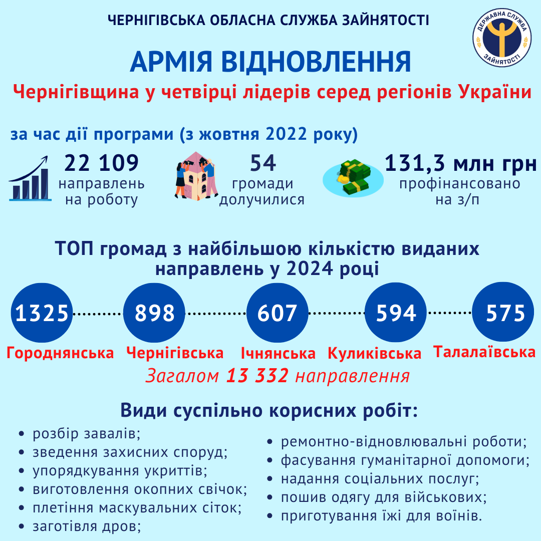 Станом на 13 листопада Чернігівська обласна служба зайнятості видала 13332 направлення на суспільно корисні роботи в рамках програми «Армія відновлення».