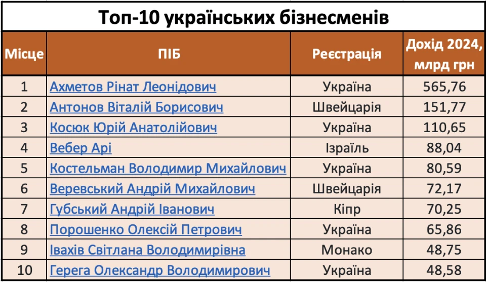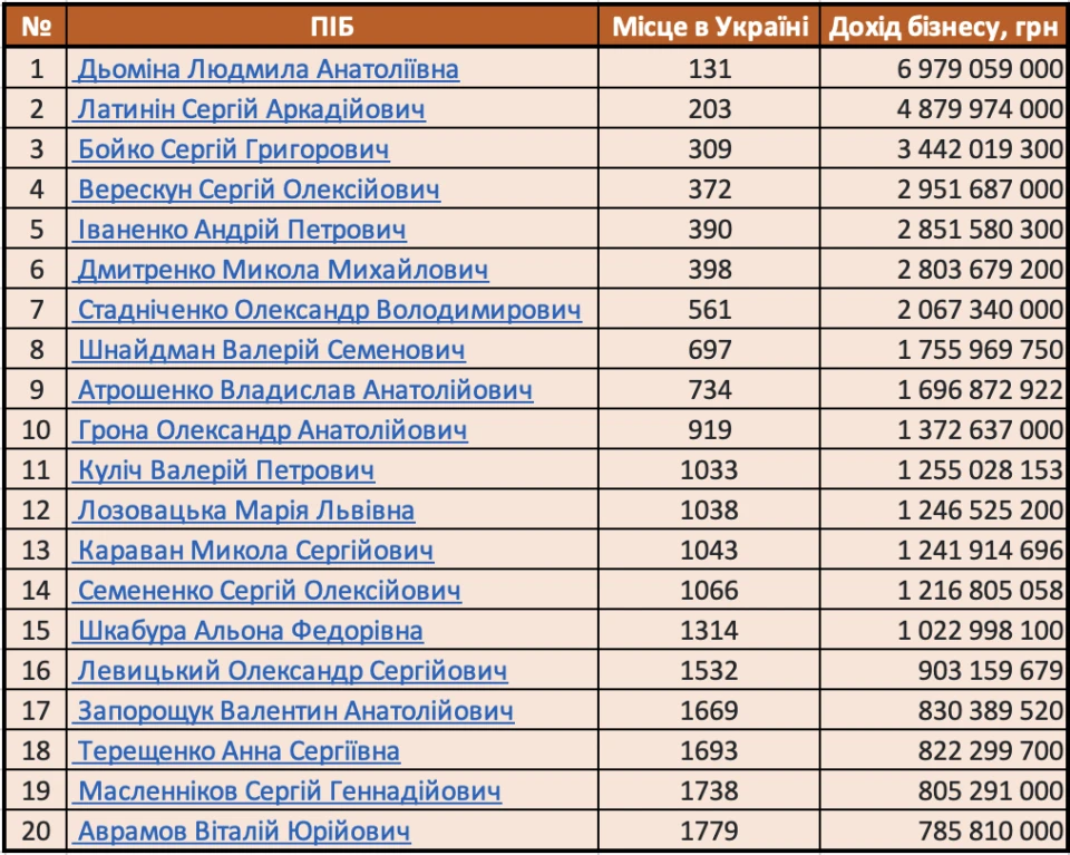 Якщо ж говорити про бізнесменів загальноукраїнського рівня, то до десятки найкращих підприємців за доходом компаній потрапили добре знайомі українцям імена. Тримає лідерство Рінат Ахметов, його компанії разом отримують близько 565,7 млрд грн доходу. Далі йде Віталій Антонов з реєстрацією у Швейцарії, який є власником мережі ОККО — його бізнеси загалом принесли 151,7 млрд грн доходу. На третьому — Юрій Косюк, власник мережі МХП, із доходом 110,6 млрд грн. У десятці є також представники Ізраїлю, Кіпру, Монако. Єдина жінка у топі — Світлана Івахів — власниця компаній WOG, КОМОта Галичина. Вона посідає 9 місце з доходом 48,75 млрд грн.