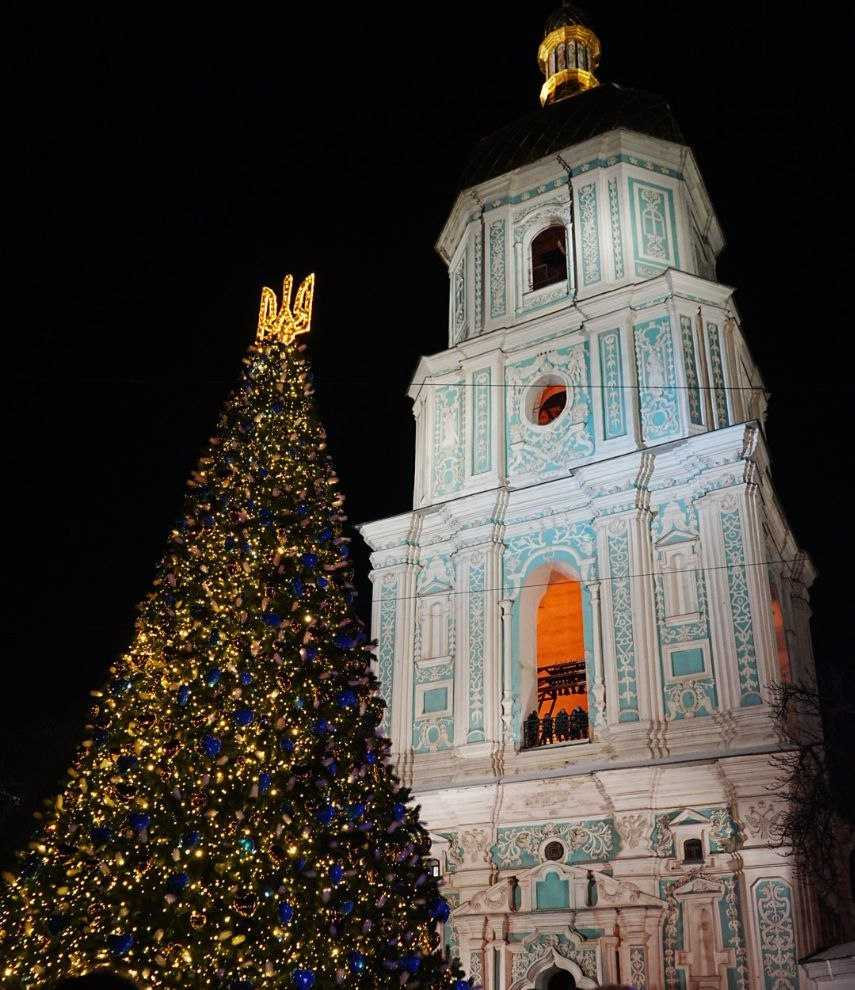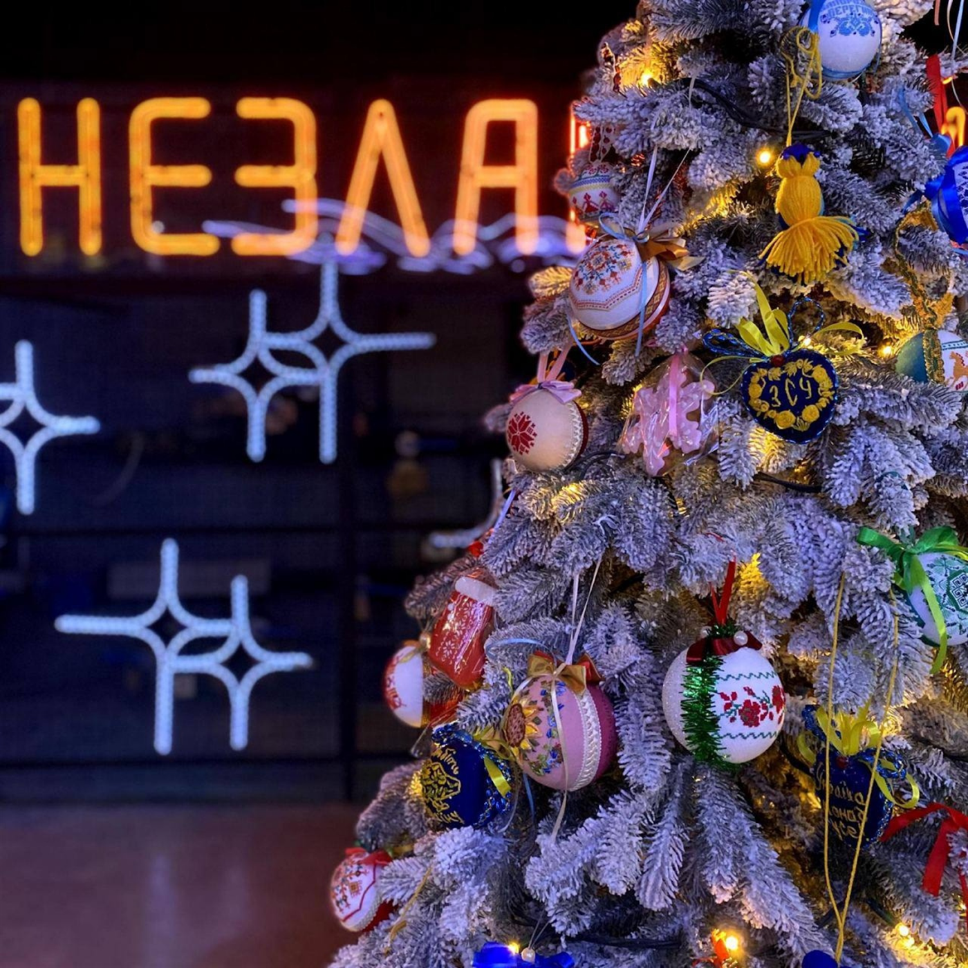 Головну ялинку України відкрили у День Святого Миколая на Софійській площі. Ялинка заввишки 12 метрів прикрашена іграшками у формі жовтих та блакитних сердець. Організатори назвали новорічні декорації “Хоробрі серця” і присвятили українським захисникам і захисницям.