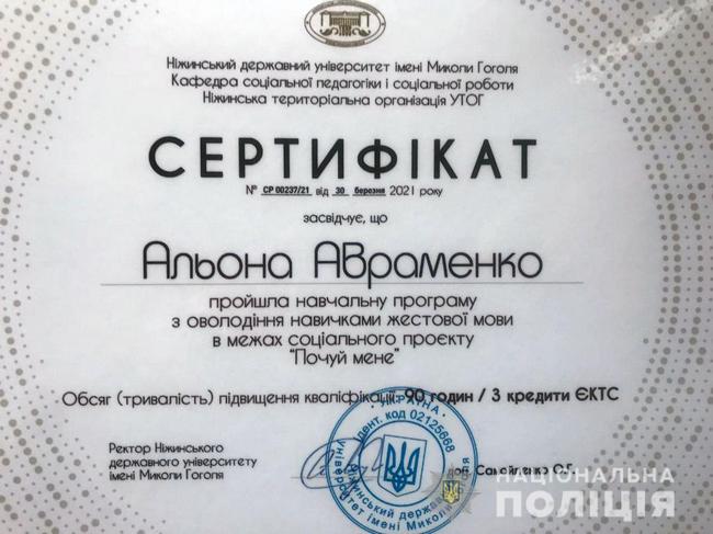 Троє поліцейських Ніжинського районного відділу поліції успішно засвоїли знання та навички комунікації жестовою мовою та отримали відповідні сертифікати про закінчення курсу.