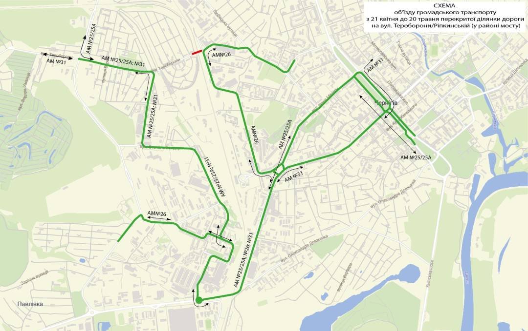 У Чернігові тимчасово змінюється рух громадського транспорту через перекриття на вулиці Тероборони/Ріпкинській (в районі мосту). Автобуси №26, №25/25А та №31 курсуватимуть за зміненими маршрутами.