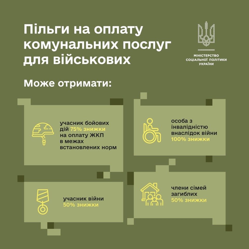 - учасники бойових дій – 75% знижки на оплату житлово-комунальних послуг в межах встановлених норм;