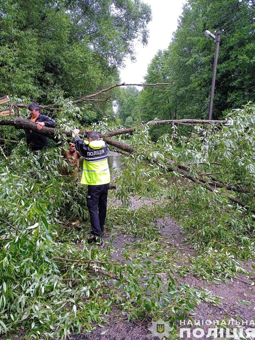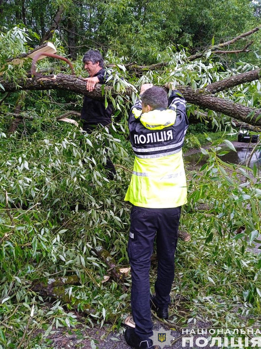 Окрім поліцейського, біля перешкоди зупинилися ще декілька водіїв. Старший лейтенант поліції організував спільну роботу зі звільнення проїзної частини. Офіцер та його добровільні помічники разом відтягли на узбіччя стовбури повалених дерев та прибрали уламки гілля. За годину рух автотранспорту був відновлений.