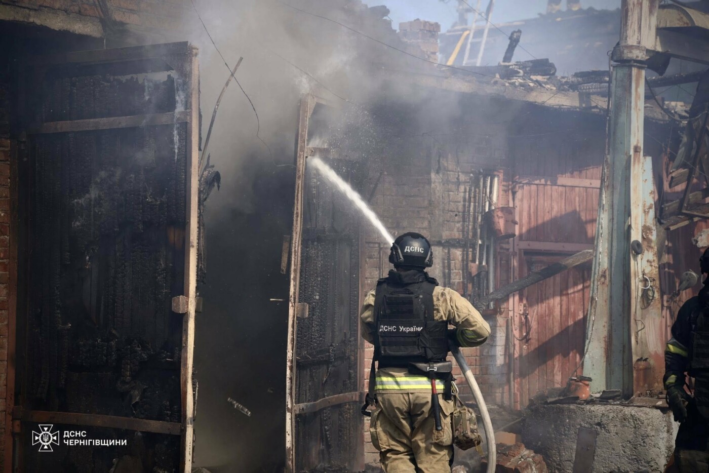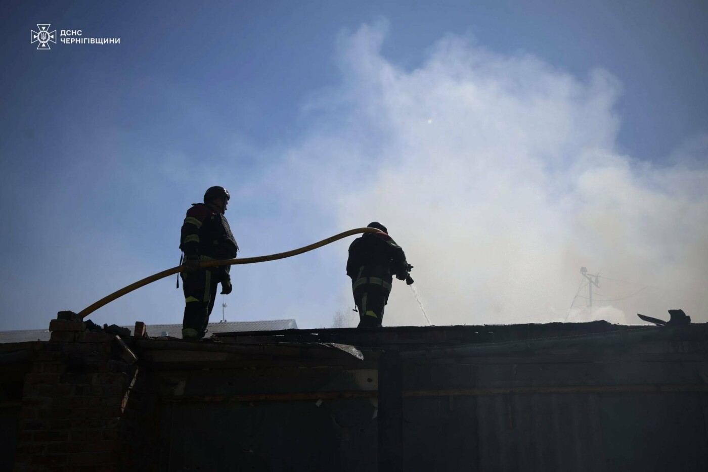 Вдень 14 квітня внаслідок удару по території одного з підприємств Чернігова виникла пожежа: загорілися п’ять гаражів та адміністративна будівля на загальній площі близько 200 кв. м.
