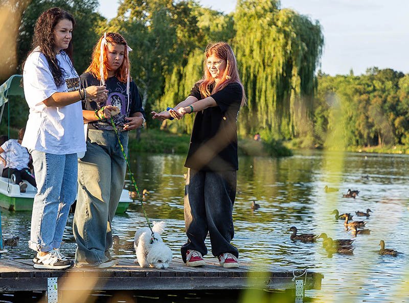 Одразу після прогулянки лісом можна перейти на інший берег річки Стрижень і погодувати качок та їх каченят. Це дуже гарний спосіб взаємодії дітей з іншими тваринами без тих же зоопарків. Також на цьому березі можна з легкістю замовити катамаран та відправитися в маленьку подорож нашим Стрижнем. Ті місця дуже мальовничі, особливо в сонячну та вже не таку спекотну погоду.