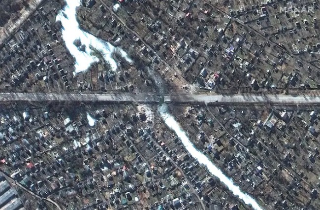 Предыдущие снимки, сделанные в тот же день, показали, что массивный конвой российских сухопутных войск приближался к Киеву, приближаясь в 20 милях от центра столицы. По словам западных представителей министерства обороны, конвой добился ограниченного прогресса с понедельника, застопорившись из-за нападений украинских военных, низкого морального духа среди российских войск и неудачного планирования.