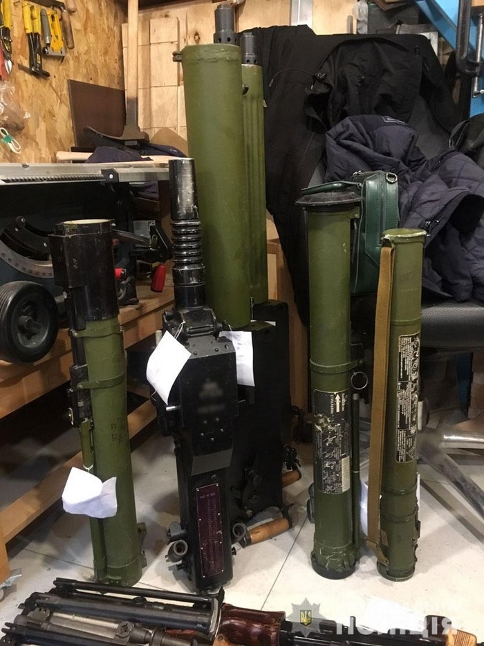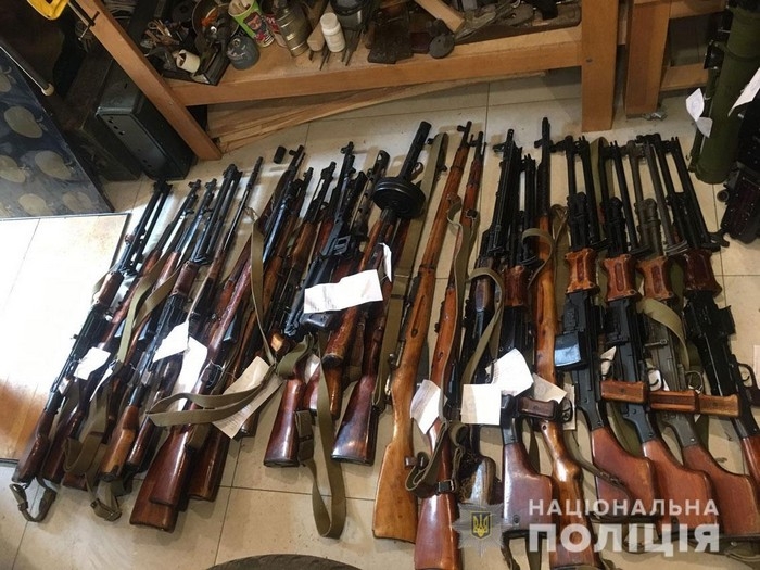Під час слідчих дій у двох гаражних приміщеннях поліцейські виявили 40 об’єктів, зовні схожих на вогнепальну зброю та вибухонебезпечні боєприпаси. Серед них, зокрема, ручні гранати, різноманітні міни, одноразові гранатомети низки моделей, одна гвинтівка та кілька карабінів Мосіна, п’ять гвинтівок СВТ, ручні кулемети Дегтярьова, автомати Калашникова, ППШ, пістолети-кулемети ППС, два станкові кулемети.
