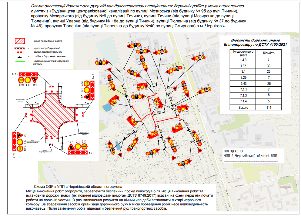 На час перекриття будуть встановлені дорожні знаки згідно зі схемою організації дорожнього руху, погодженою в управлінні патрульної поліції в Чернігівській області Департаменту патрульної поліції, яке забезпечить нагляд за організацією руху транспорту.