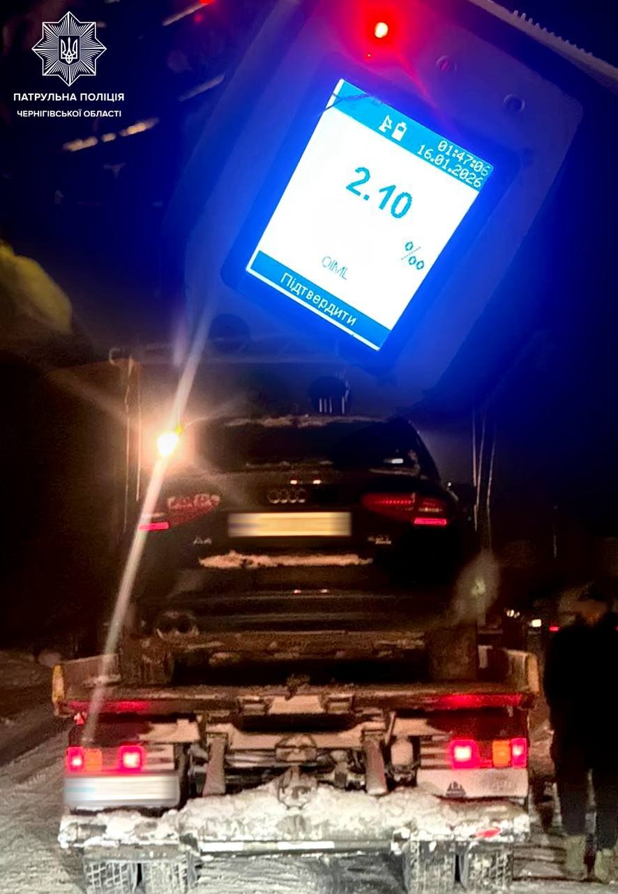 16 січня під час дії комендантської години на вулиці Мартина Небаби у Чернігові патрульні зупинили автомобіль Audi A4, за кермом якого перебував 22-річний чоловік із явними ознаками алкогольного сп‘яніння.