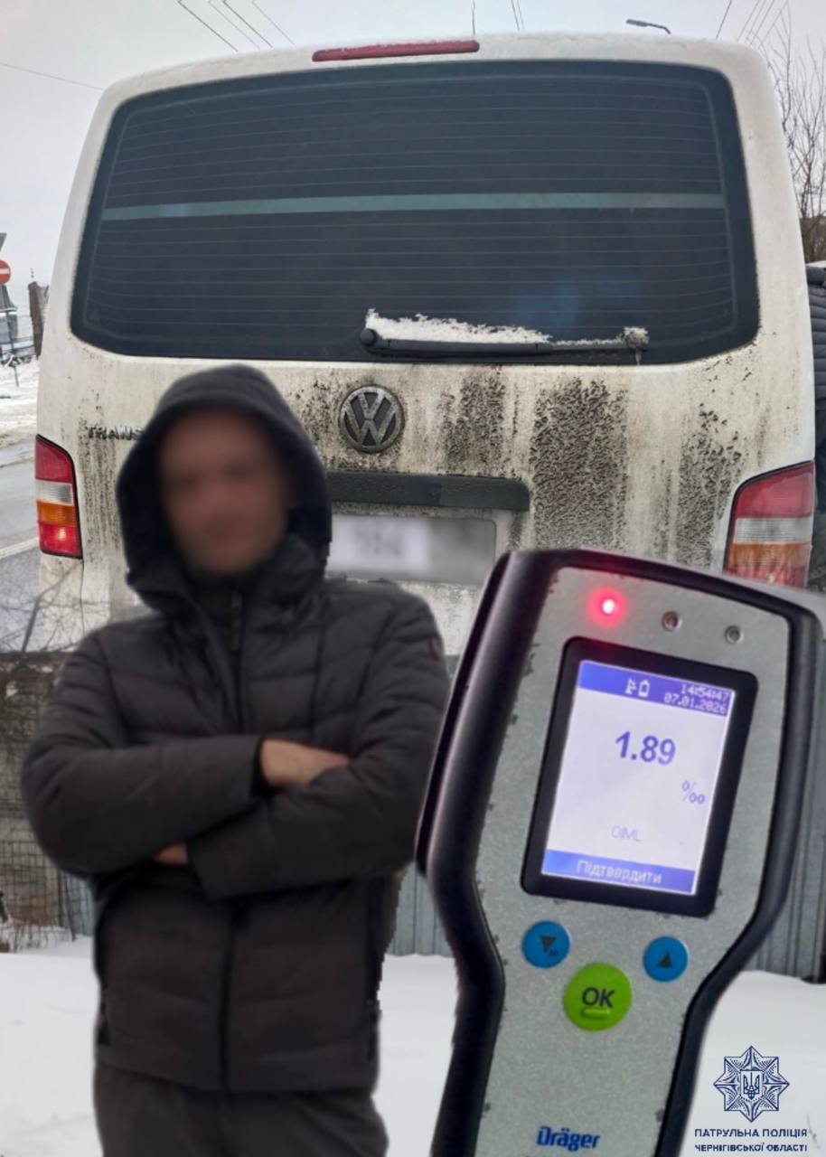 Як зазначають у пресслужбі Патрульної поліції Чернігівської області, за кермом перебував 47-річний чоловік із ознаками алкогольного сп’яніння. Він погодився пройти огляд за допомогою приладу Драгер, який показав 1,89 проміле.