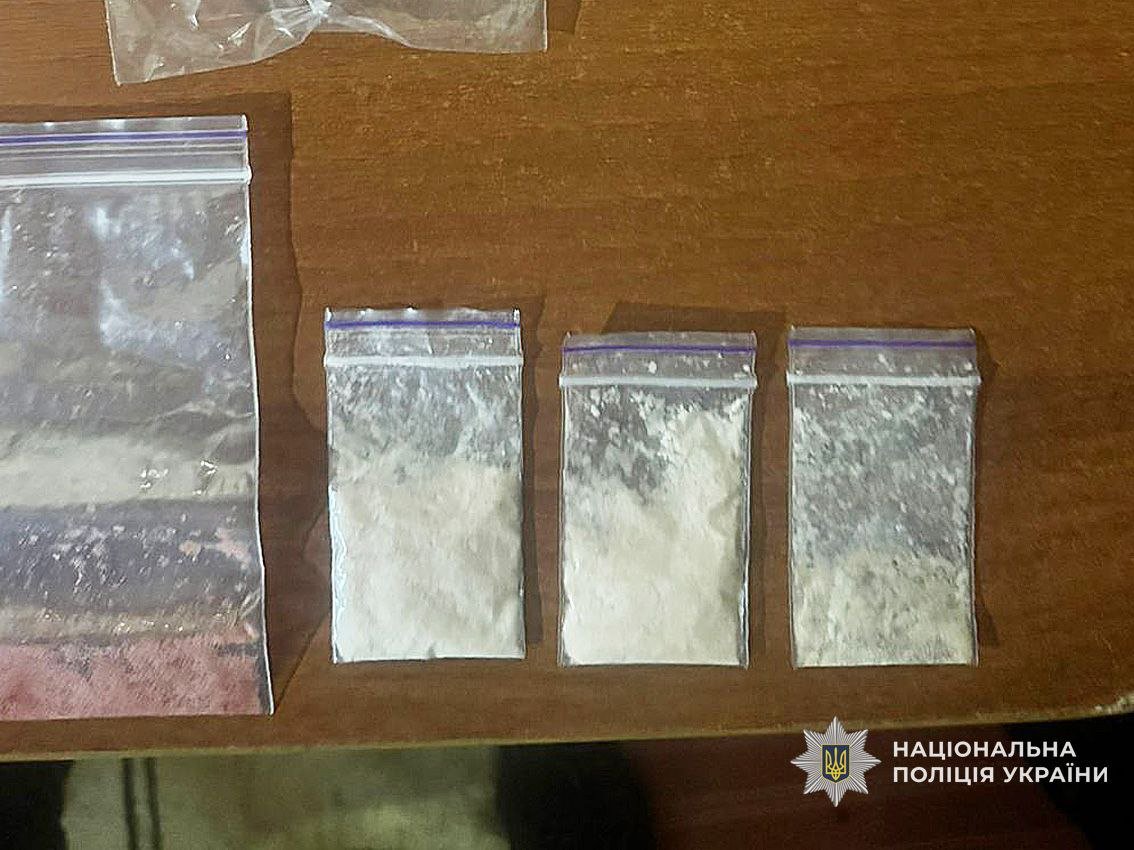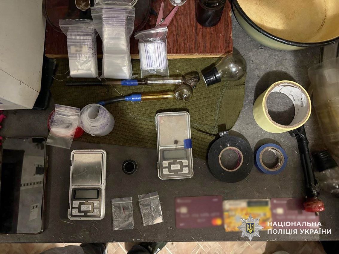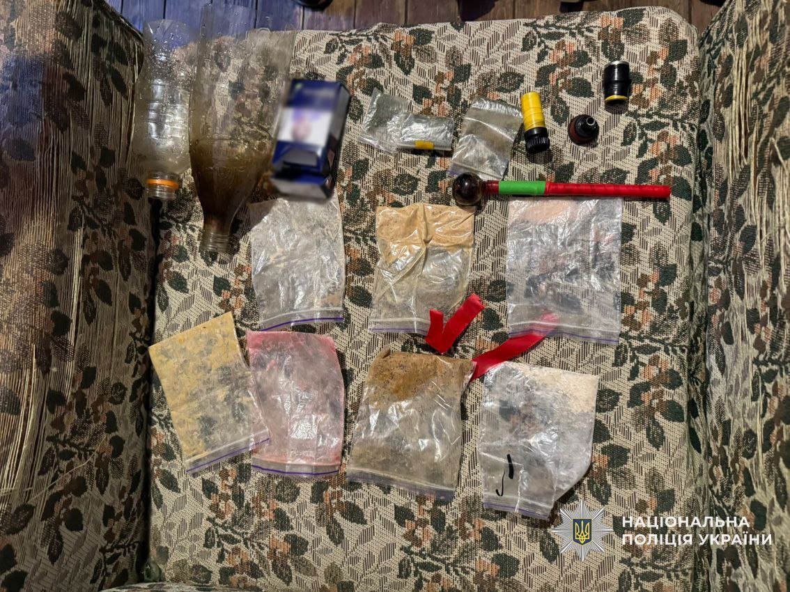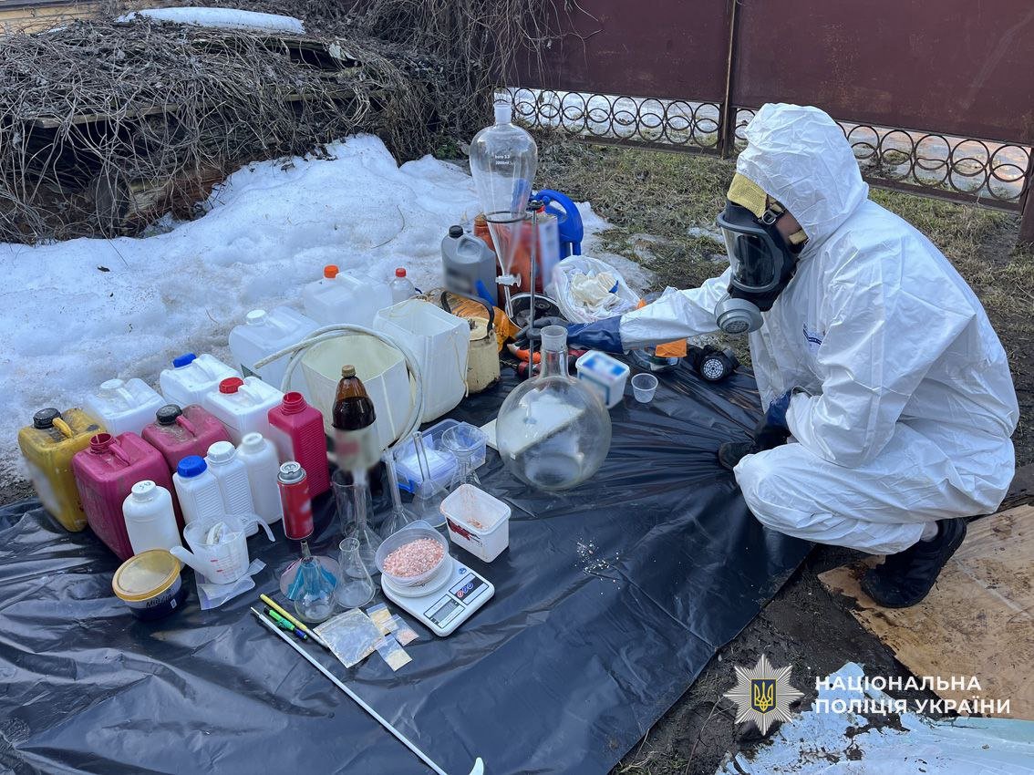 За силової підтримки бійців КОРД та кінолога зі службовим собакою поліцейські провели санкціоновані обшуки, під час яких вилучили півкілограми розфасованих солей Alfa-PVP, лабораторне обладнання, пластикові каністри з хімічними рідинами, респіраторні маски, захисні окуляри, засоби для фасування та електронні ваги.