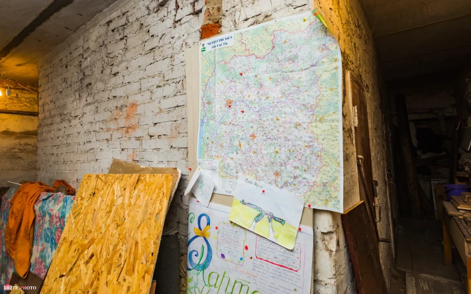 На стіні, біля входу, висить карта Чернігівщини. Червоні шпильки «впилися» в Городню, Чернігів, Куликівський район. Так мешканці стежили з підвалу за просуванням ворожих військ. Поруч — намальований кольоровими олівцями і фломастерами плакат до 8 березня. На дерев’яних фанерах — частини текстилю від постелі. На столах — сірники, свічки, кава, продукти, консервація.