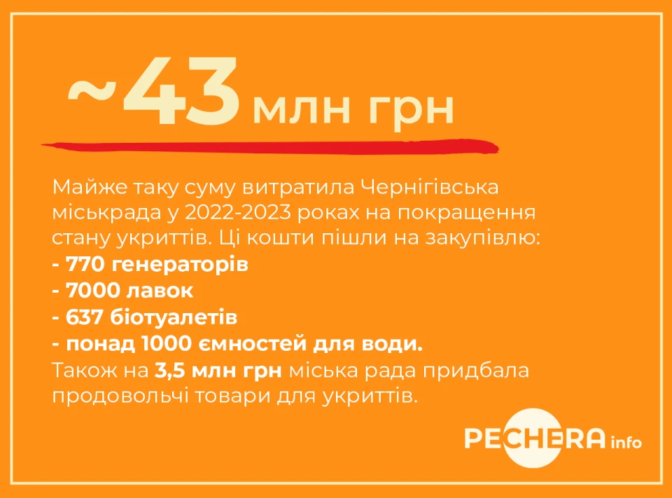 В березні 2023 року заступник міського голови Чернігова Віктор Геращенко на засіданні міської комісії з техногенно-екологічної безпеки та надзвичайних ситуацій повідомив, що на покращення укриттів Чернігова міська рада виділила майже 43 млн грн. За його словами, ці кошти пішли на закупівлю 770 генераторів, 7000 лавок, 637 біотуалетів та понад 1000 ємностей для води.