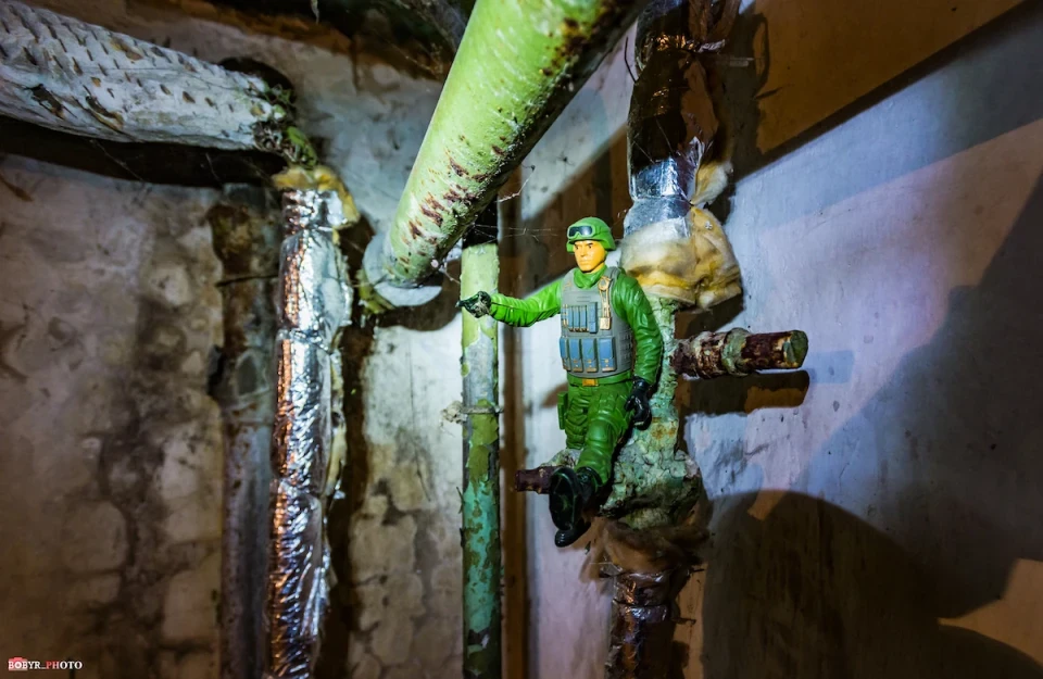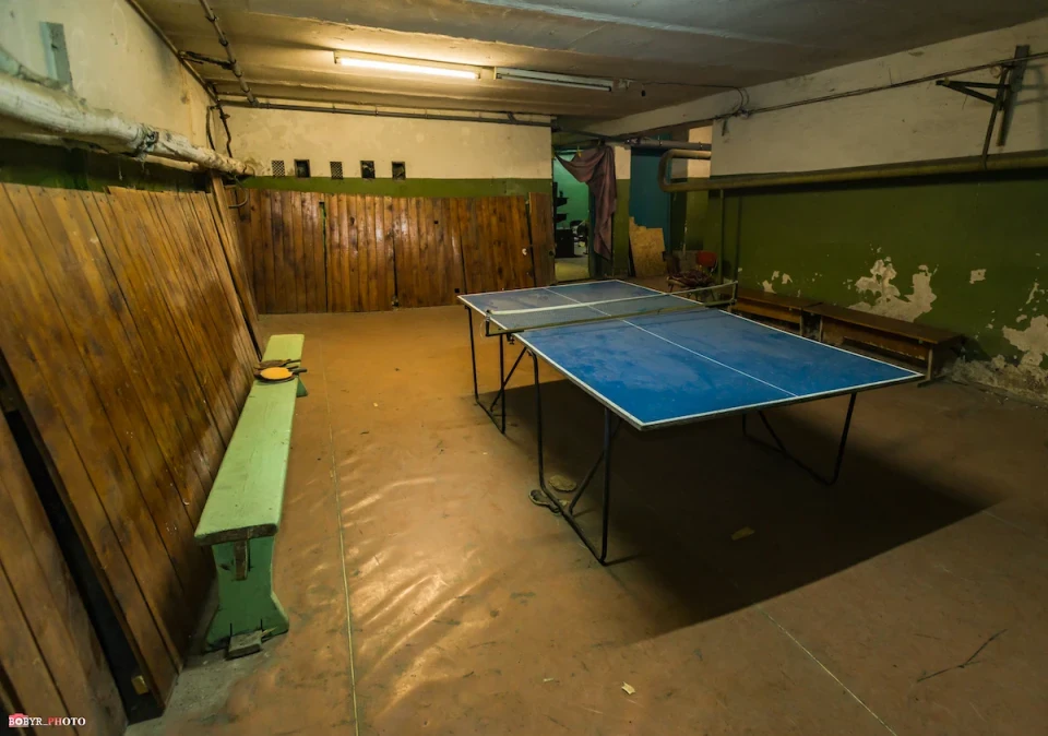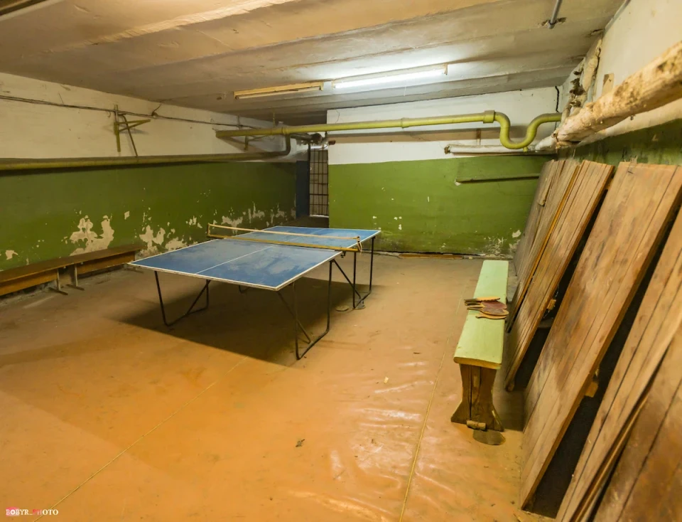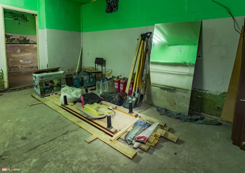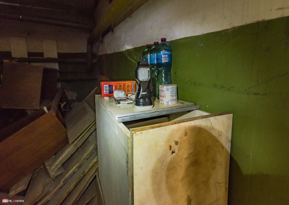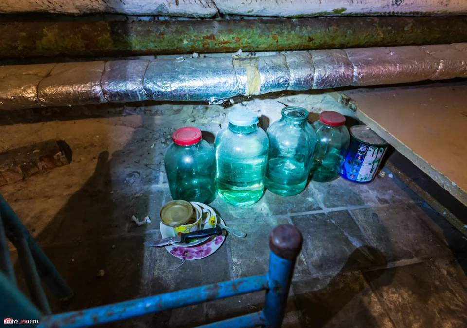 Спускаємося сходами. Тут так тепло, що спітнів навіть об’єктив фотоапарату. У кількох кімнатах біля стільців, залишеного посуду та дитячих іграшок бачимо залишки запасів води. Їх сюди привезли працівники ЖКГ. Вони і відповідальні за цей підвал.