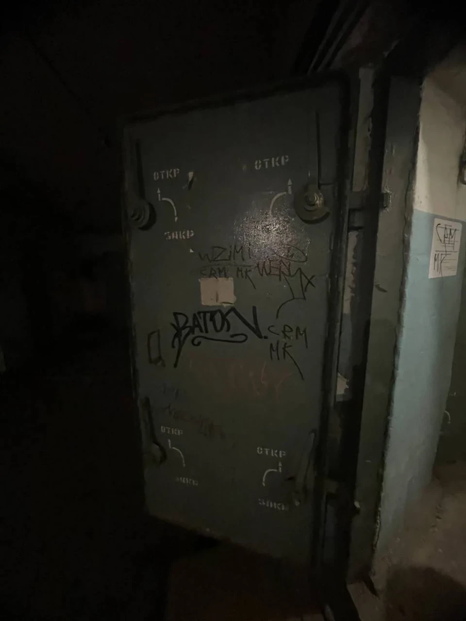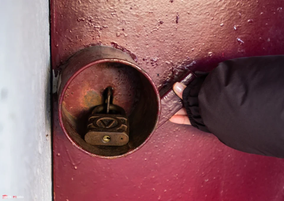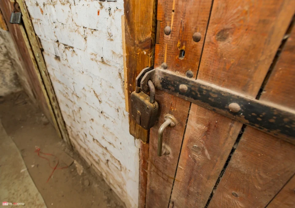 Вхід до цього підвалу теж боронить навісний замок. На пофарбованих у червоний колір дверях чорних маркером виведені номери телефонів. По той бік слухавки розкажуть, де взяти ключі. Така опція, радше, для нетутешніх, бо ж усі мешканці цієї п’ятиповерхівки мають власні ключі.
