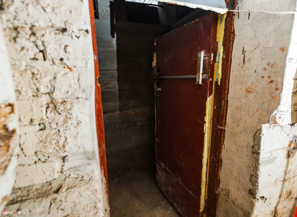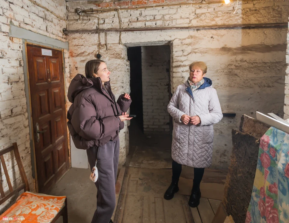 Металеві двері нам відчиняє мешканка цього будинку Тетяна Ященко. Спускаємося разом сходами. Це підвал, розташований нижче рівня будинку, а не укриття цивільного захисту. Хоча за інформацією мешканців, тут не оновлювали вентиляцію, повітря не відчувається затхлим, є кілька виходів і доволі тепло.