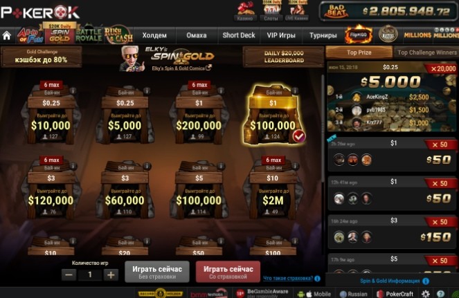 В турнирах Spin&Gold в GGPokerok всего за $1 можно выиграть $100,000, но вероятность такого события невысока