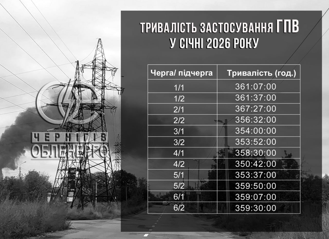 У січні 2026 року мешканці Чернігівської області в середньому 357 годин 59 хвилин провели без електропостачання через застосування графіків погодинних відключень (ГПВ).