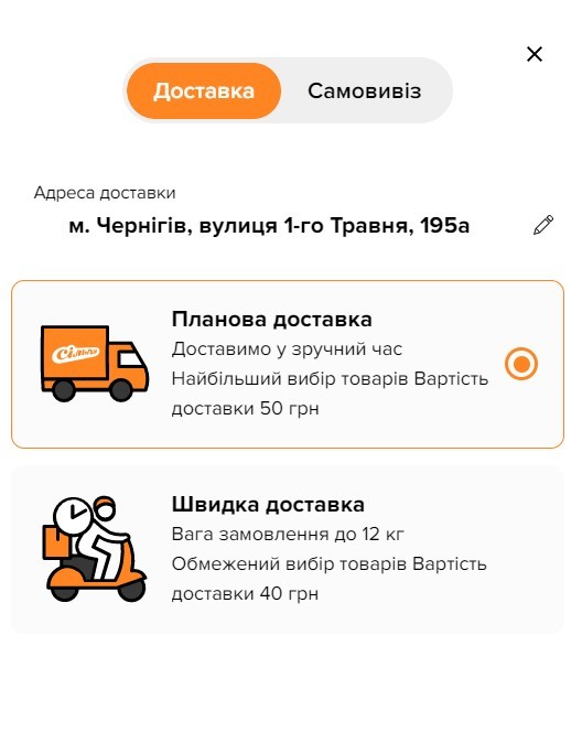 Що стосується оперативності. На даний час є два види доставки — планова і швидка. Скористатися швидкою у Чернігові, можна лише за умови, якщо ви замовляєте продукти до 12 кг., і якщо вони з магазинів «Сільпо» по вул. Захисників України, 9А та з того, який на цокольному поверсі «ЦУМу», що по Проспекту Мира, 49. Але в цьому випадку, як нам пояснив кур’єр, ви маєте проживати в певному радіусі від цих магазинів, тобто на вулицях, які наближені до цих двох локацій. Швидку доставку здійснюють на електроскутерах жовтого кольору. А планову на машинах. Планова доставка здійснюється у певні часові проміжки — з 11.00 до 13.00, з 13.00 до 15.00 , з 15.00 до 17.00, з 17.00 до 19.00 та з 19.00 до 21.00. У разі планової доставки ви можете обрати будь-який магазин, де б хотіли придбати продукти.