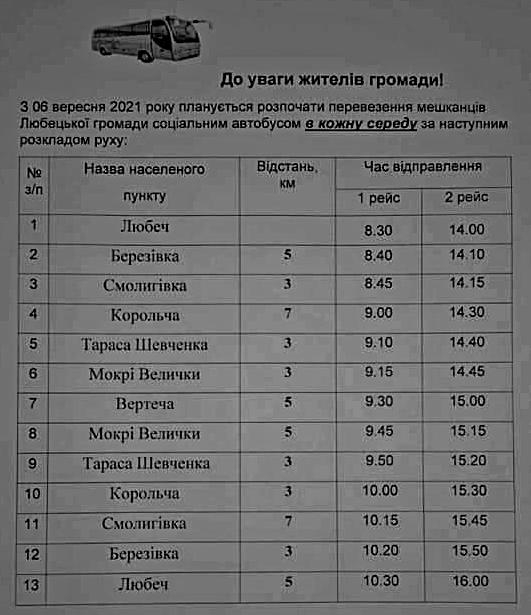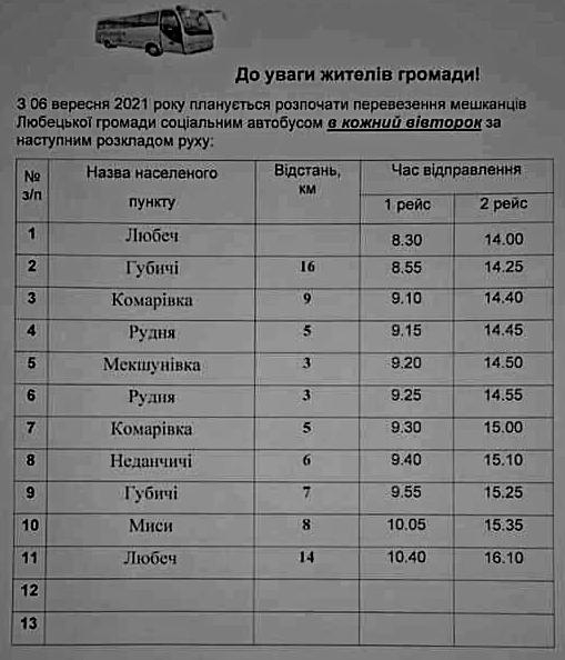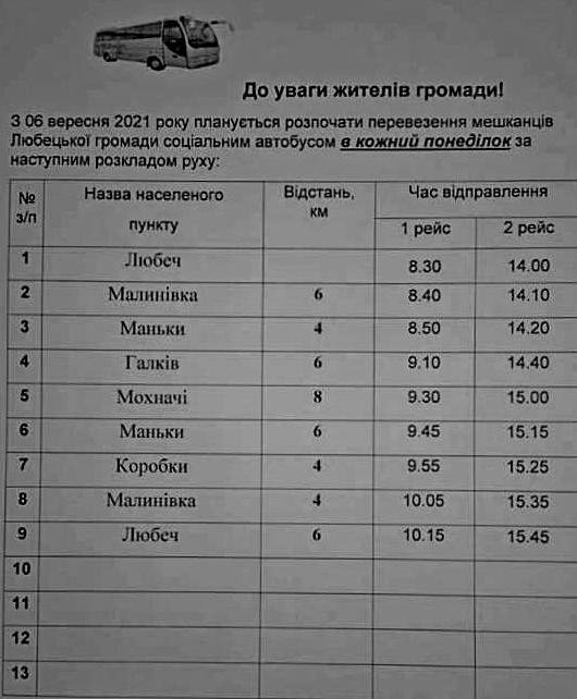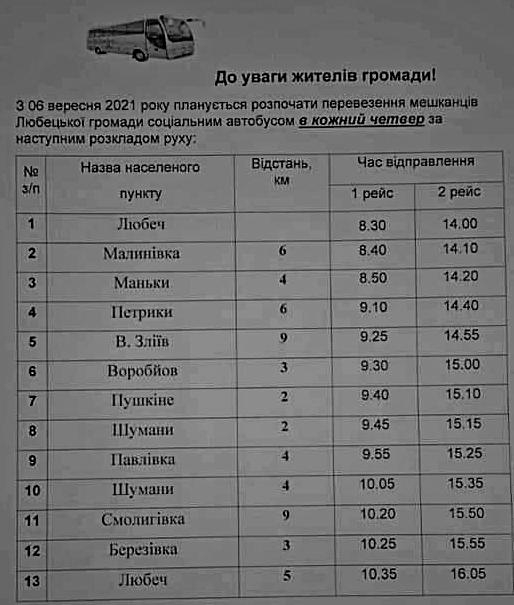 З 6 вересня в Любецькій громаді на Ріпкинщині курсує безкоштовний автобус.