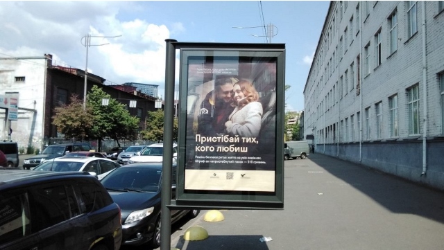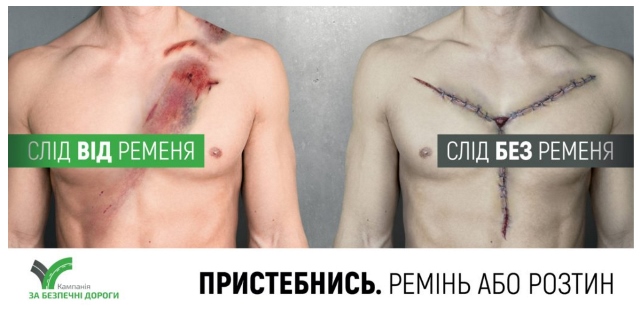 На 180 билбордах в больших и малых городах Украины были размещены изображение мужчины с синяками от ремня безопасности и другое его фото со следом от вскрытия. Авторы рекламы предлагают шокирующее сравнение, показывая последствия автокатастрофы для человека, который игнорирует пояс безопасности.