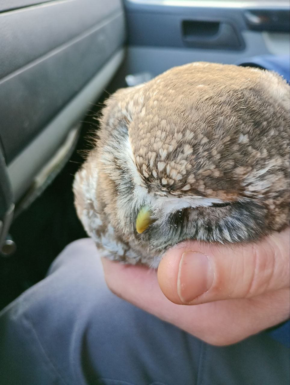 Під час повернення з виїзду колеги з ГАЗМЕРЕЖІ — Сергій Ісаєнко та Віктор Сусленко — помітили на дорозі маленького сича. Він лежав нерухомий на асфальті, холодний і майже непомітний серед сірої зими.