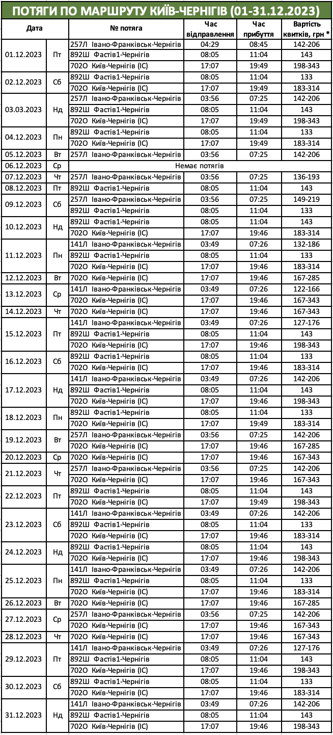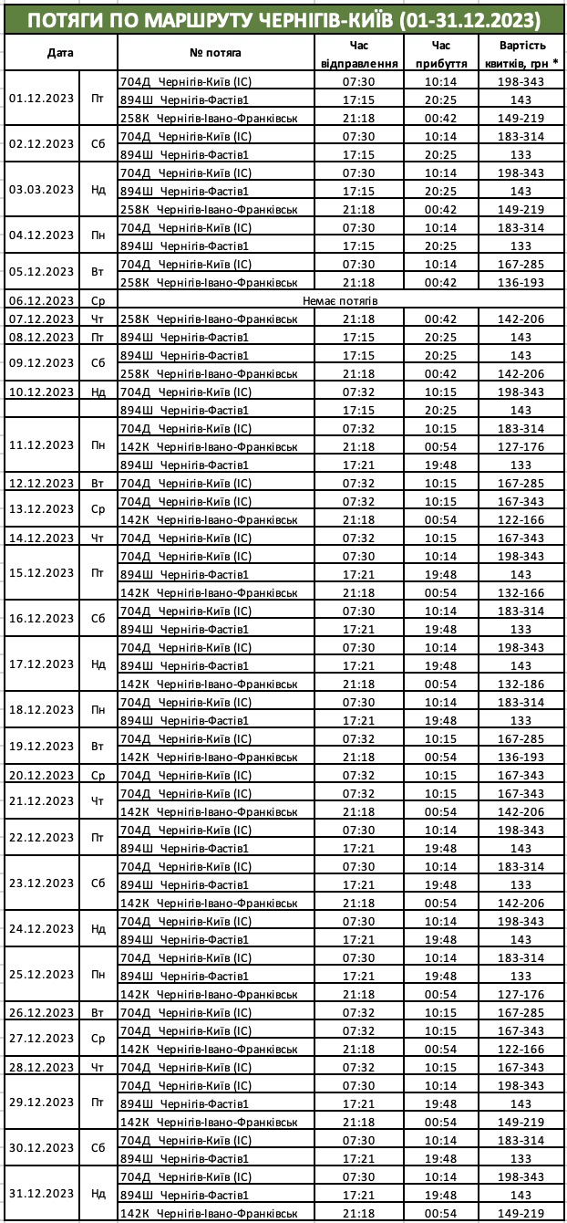 Ціни вказані згідно мобільного додатку «Укрзалізниці» і тільки на ті дати, на які в цьому додатку є доступна інформація. В касах вокзалу вони будуть на кілька гривень дорожчими. Але насправді, протягом грудня ціни на пасажирські перевезення скоріше за все залишаться незмінними. Тож, користуйтеся та поширюйте!