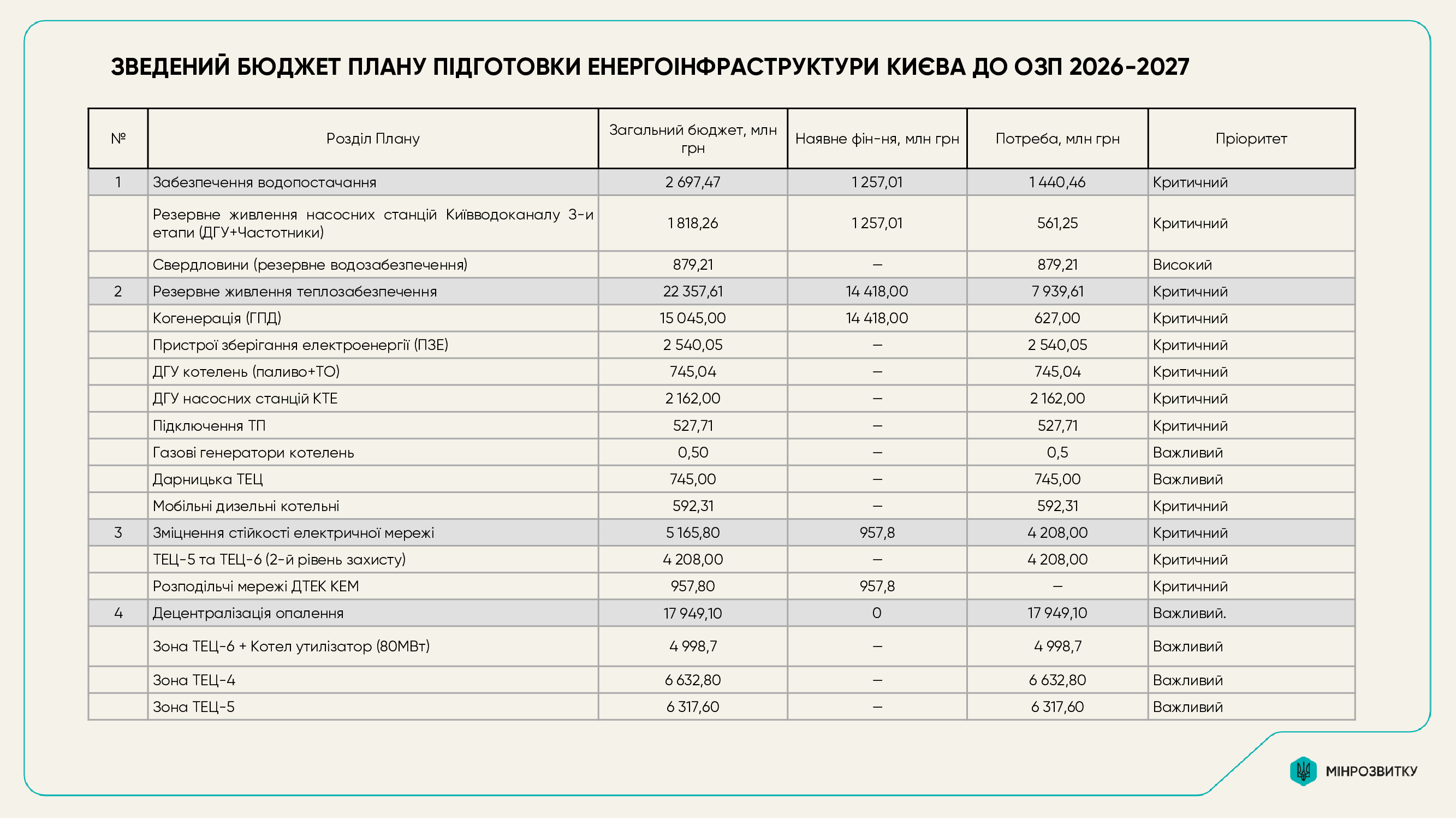 Открытая часть плана содержит ключевые предложения по усилению защиты критической инфраструктуры столицы, резервированию объектов энергетики, обеспечению стабильной работы теплоснабжения и водоснабжения, а также параметры финансирования и дефицита по отдельным направлениям.