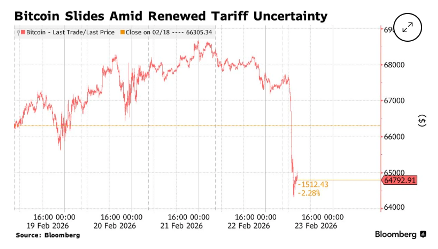 У понеділок вартість провідної криптовалюти продемонструвала різке зниження, досягнувши найнижчого рівня з початку лютого. Падіння цифрових активів спровокувала загальна макроекономічна невизначеність та суперечливі заяви офіційного Вашингтона щодо статусу міжнародних торговельних угод після рішення Верховного суду США. Про це повідомляє Bloomberg, пише УНН.