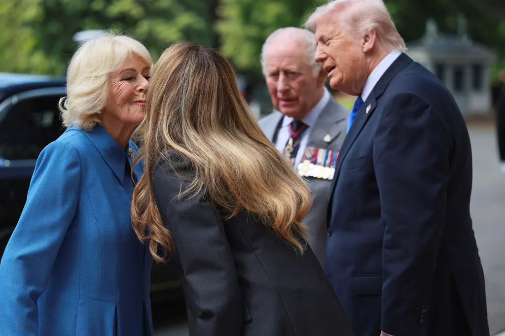 Камілла та Меланія обнялися і поцілувалися в щоку.