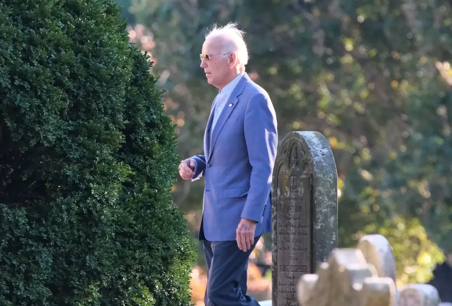 Байден ішов повільно, тримаючись за жінку для підтримки, а помітний шрам над правим оком нагадував про нещодавню операцію з видалення раку шкіри. Після 50-хвилинної служби він привітав парафіян біля церкви.