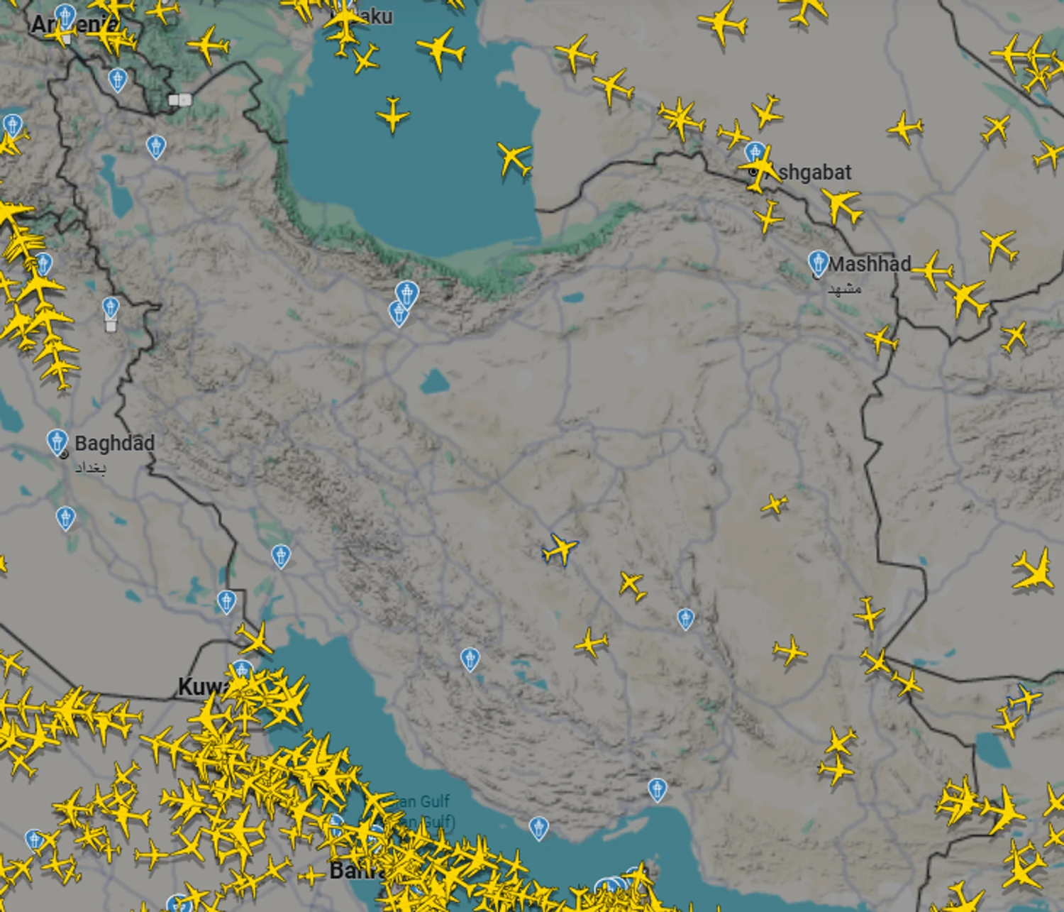 Наразі над Іраном перебуває лише декілька літаків на півночі та сході країни, які прямують, зокрема до Тбілісі, Алмати, Дубаю.