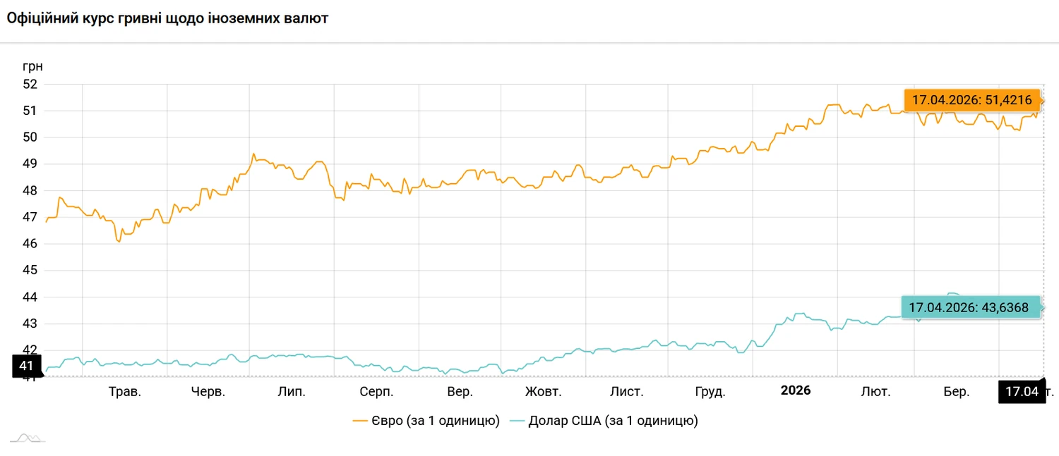 Також НБУ встановив офіційний курс євро до гривні на 17 квітня на рівні 51,4216 грн/євро, послабивши гривню за день на 15 копійок.
