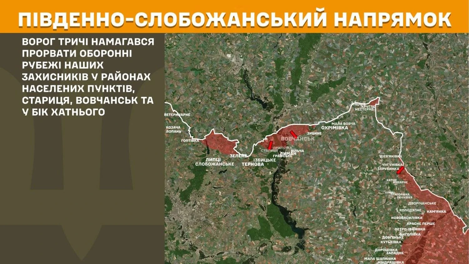 На Південно–Слобожанському напрямку ворог тричі намагався прорвати оборонні рубежі українських захисників у районах населених пунктів, Стариця, Вовчанськ та у бік Хатнього.