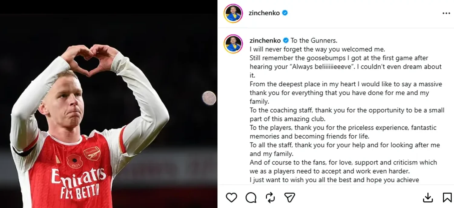 Сам Зінченко у соцмережі написав: "З нетерпінням чекаю на початок". Крім того, він звернувся до "Арсеналу", подякувавши клубу, партнерам і вболівальникам за підтримку і досвід, і підкреслив, що назавжди збереже теплі спогади про час у Лондоні.