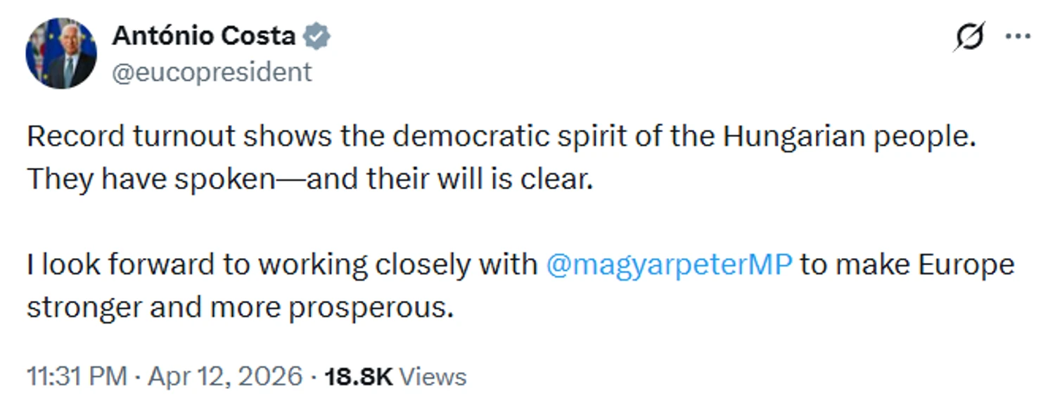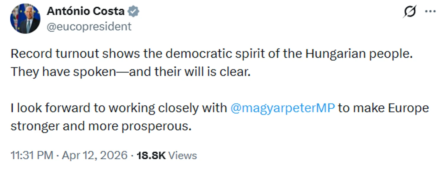 Вітаю всіх угорських громадян з історичними виборами. Бажаю працювати разом, Петере Мадяре, заради кращого майбутнього для всіх європейців