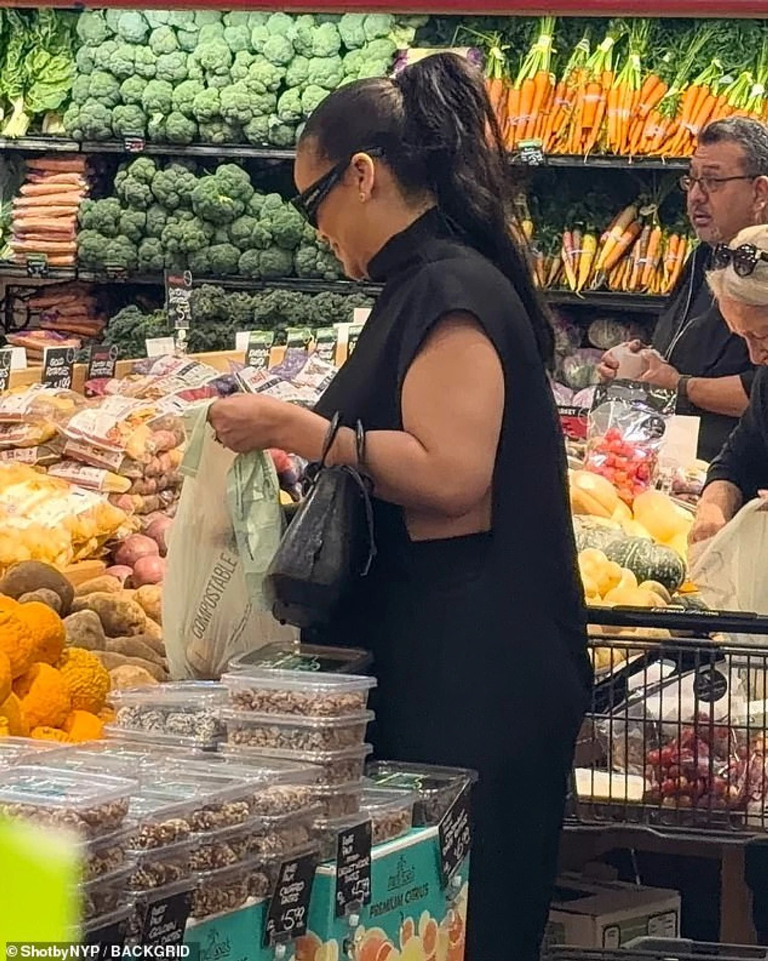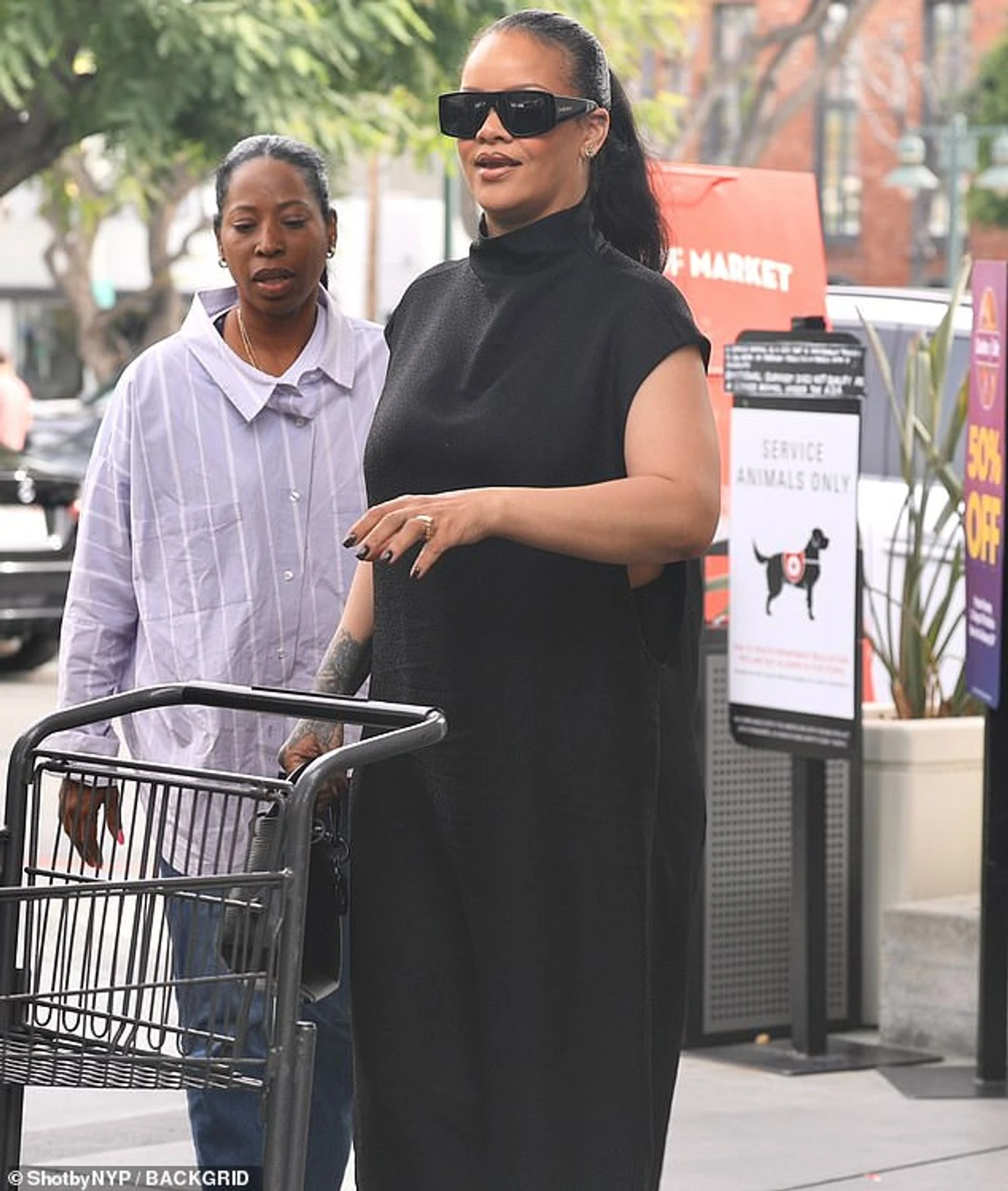 Отож, під час походу по продукти Ріанна виглядала стильно і водночас повсякденно: чорний топ без рукавів із прорізами з боків, широкі брюки, великі сонцезахисні окуляри та сумка, підібрана під чоботи.